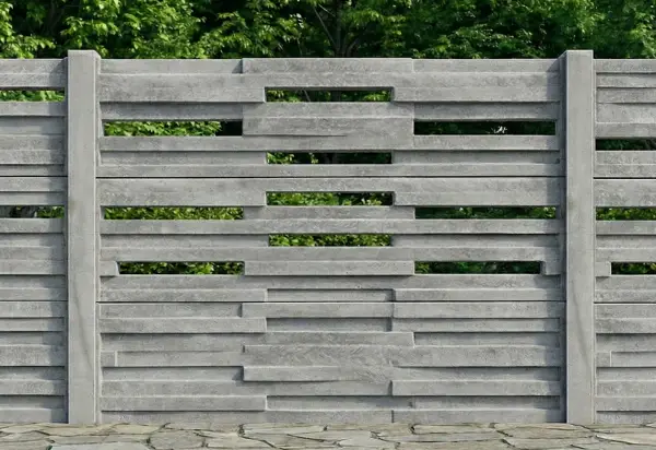 Moderní 3D betonový plot s horizontálními mezerami, který spojuje trvanlivost betonu a vzdušný design.