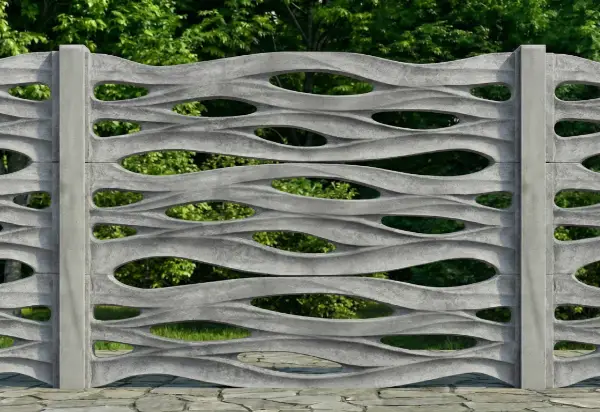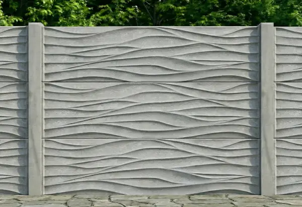 Plný betonový panel s výrazným 3D reliéfem vln, který dodává oplocení dynamiku a eleganci.